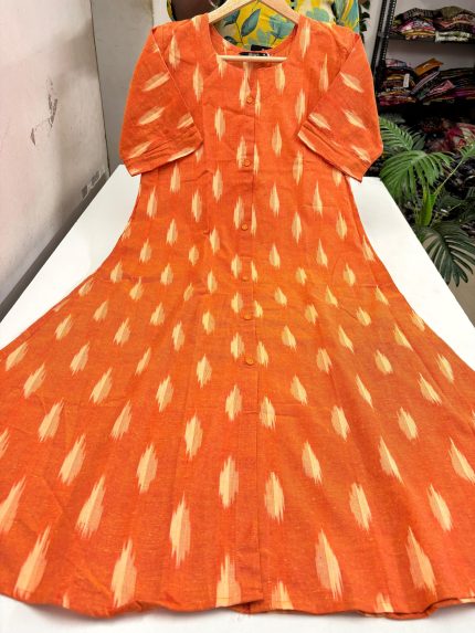 Ikkat Handloom Pure Cotton A Line Kurti Side Pocket Available Fabric: Handloom Pure Cotton Kurti Length: 44 inches Sleeve Length: