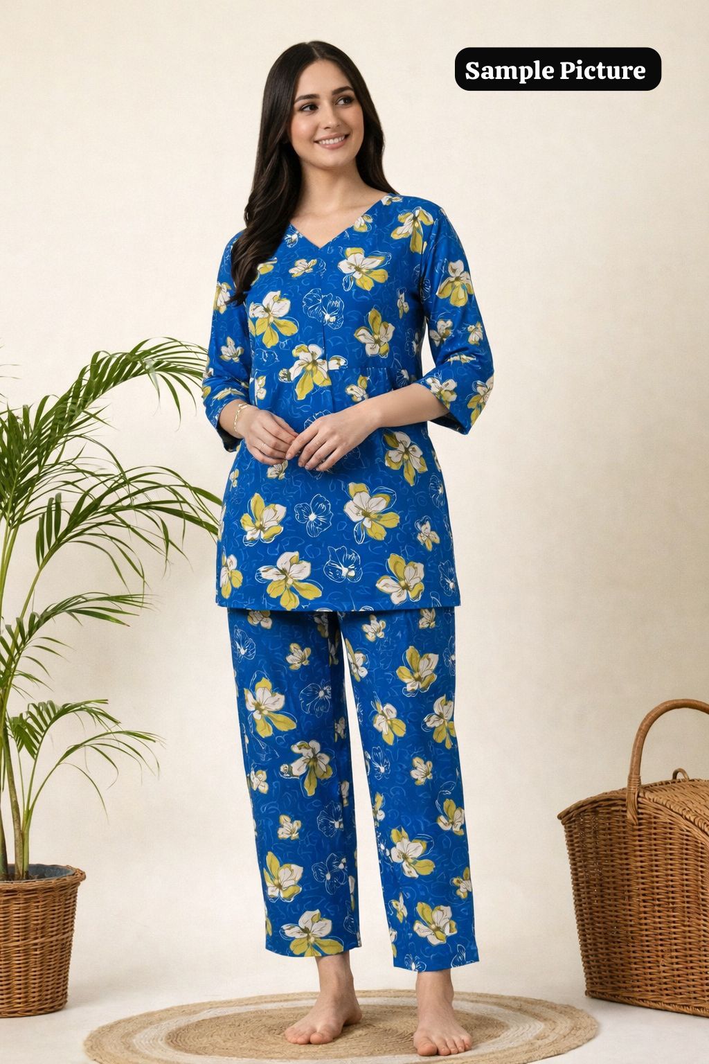 Women’s Cotton Night Suit Elasticated waist With side pocket on the pant Fabric: Cotton Measurements: Top Length – 30 to