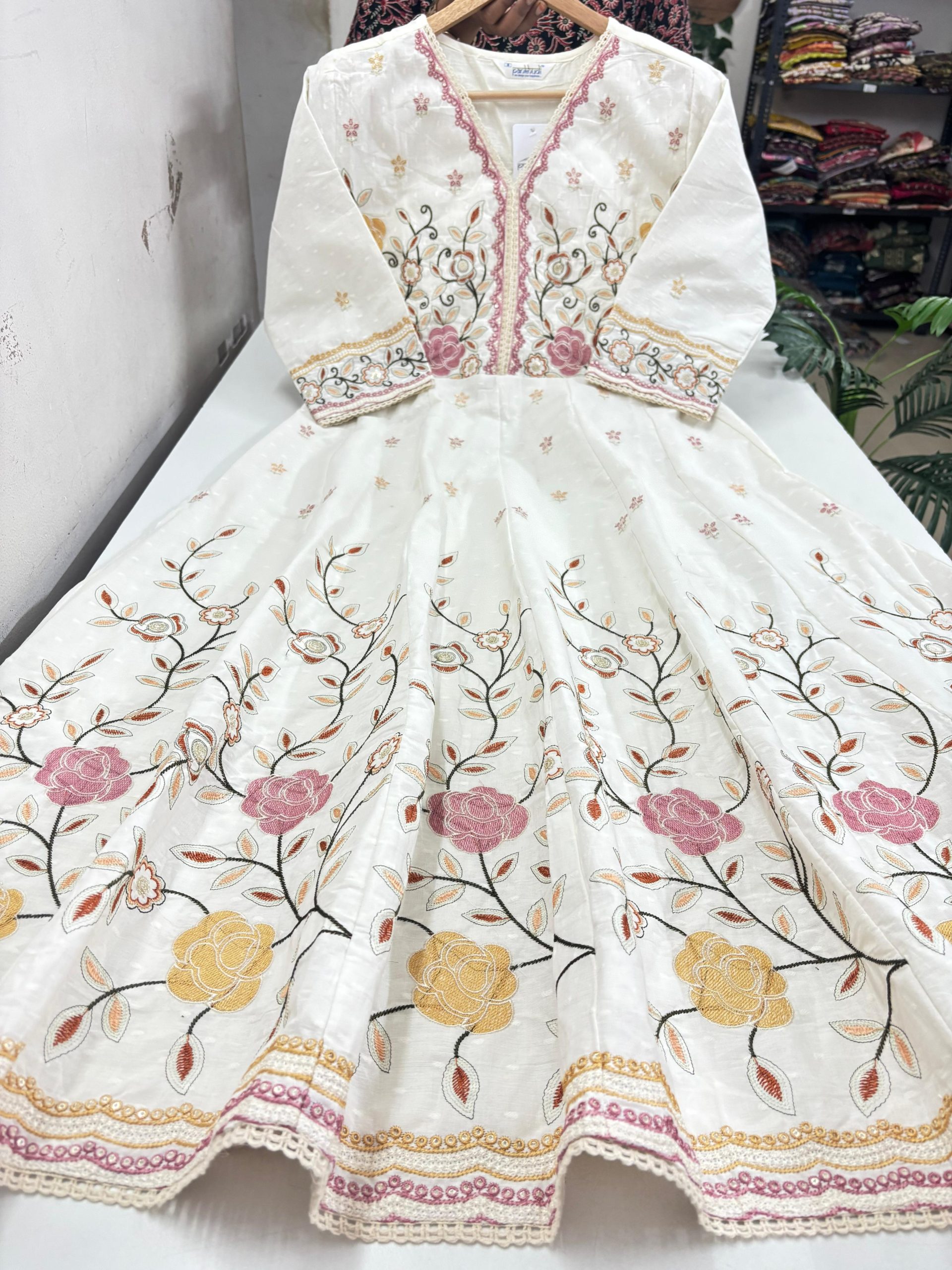 Hakoba A Line Frock With Puff Sleeves Beautiful Embroidery Thread Work On Yoke Portion Stitched With Cotton Lining Length: 44