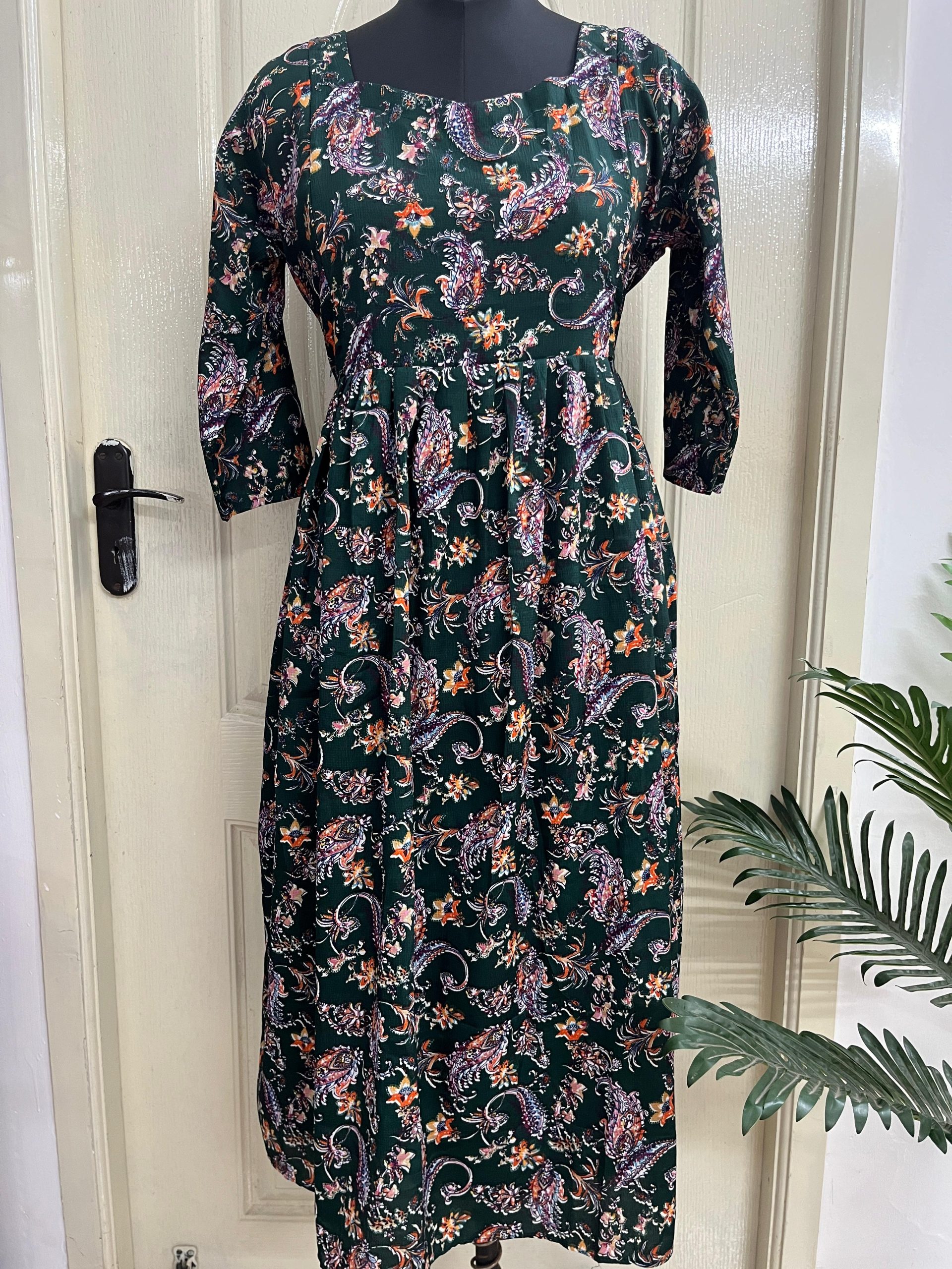 CHIFFON FABRIC WITH SATIN JACQUARD A LINE FROCK WITH PUFF SLEEVE STTICHED WITH CREPE LINNING MACHINE EMBROIDERY ON NECK PART