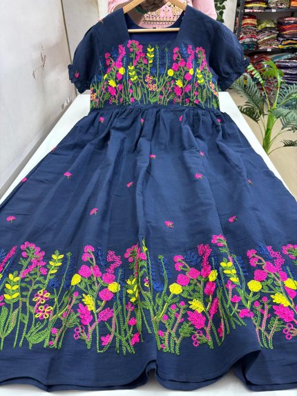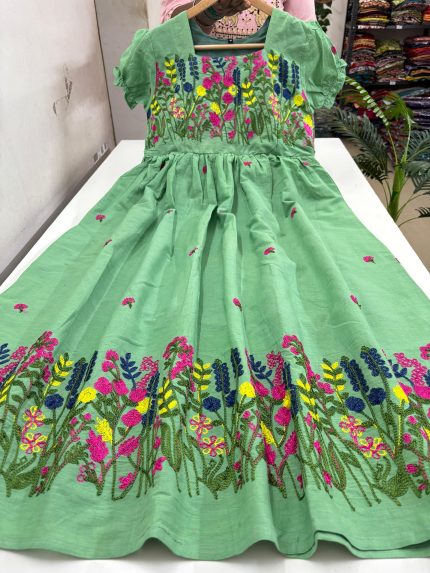 Hakoba A Line Frock With Puff Sleeves Beautiful Embroidery Thread Work On Yoke Portion Stitched With Cotton Lining Length: 44