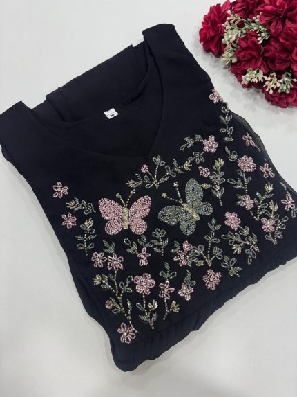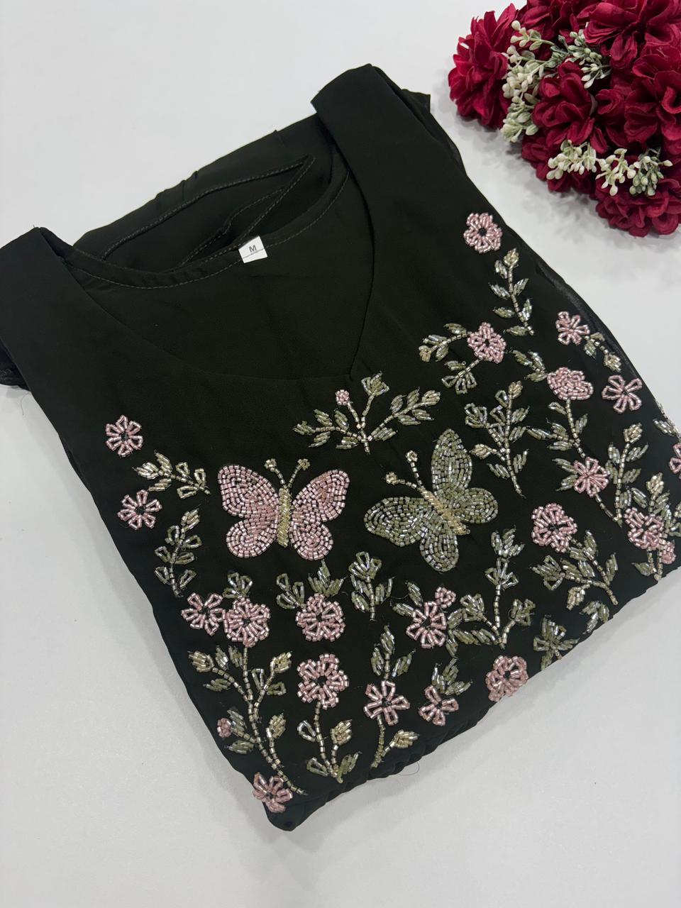 Party Wear Jewel Neck Handwork Kurtis Stitched With Lining Size Mentioned In Picture Length 46 Inches