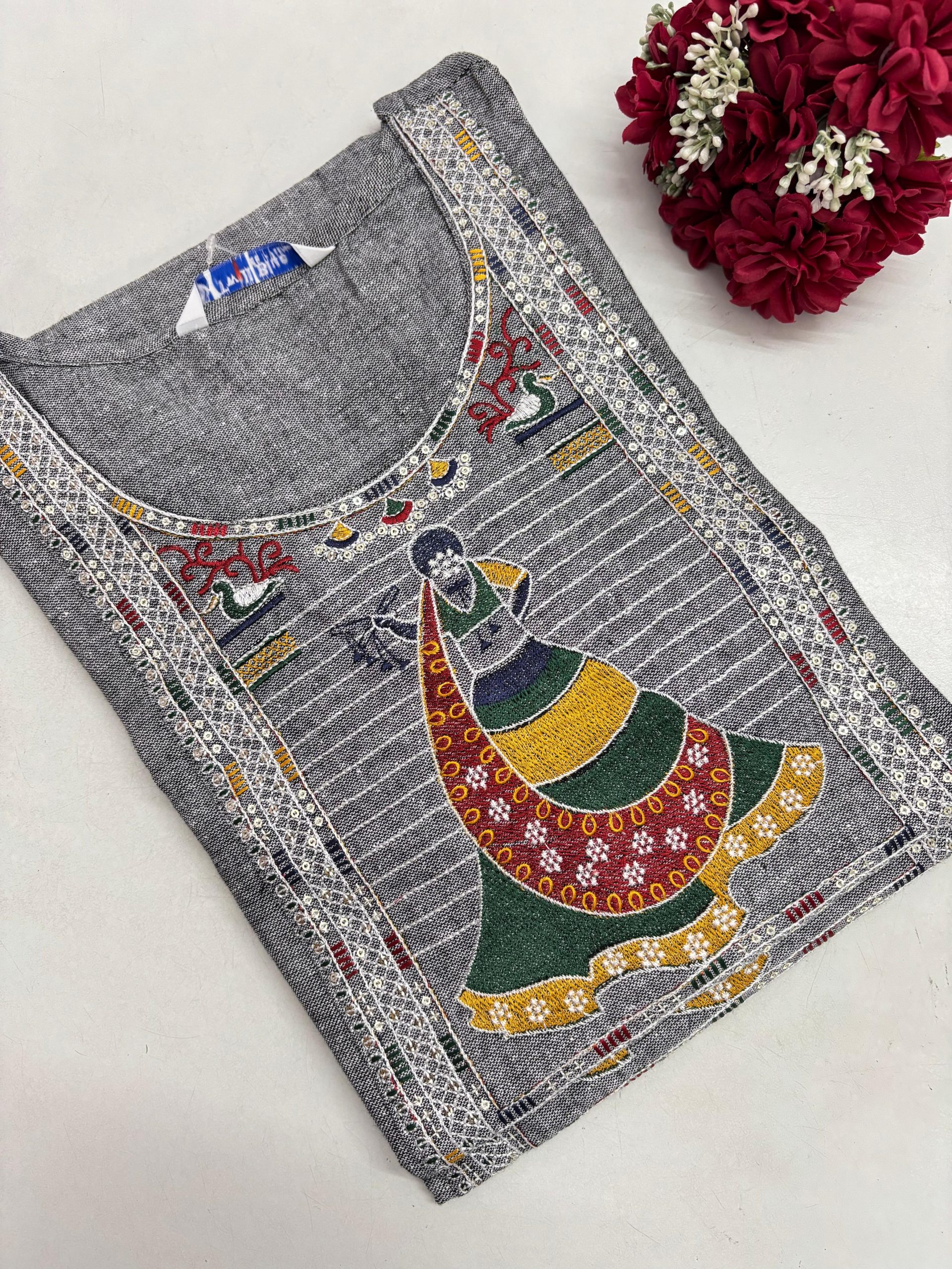 Handloom Cotton Embroidery Kurti – Grey & Blue Mixed