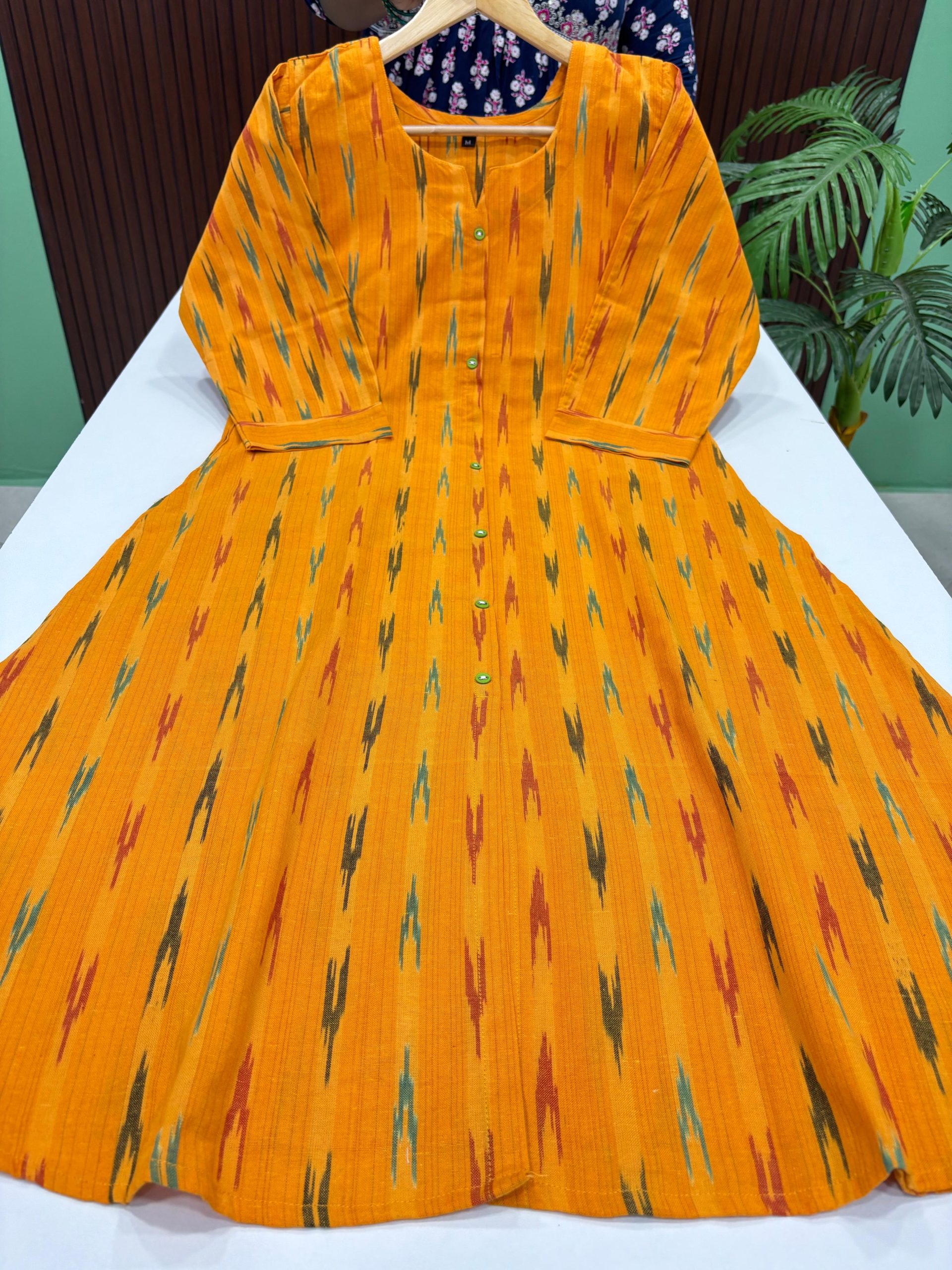 Ikkat Handloom Pure Cotton A Line Kurti Side Pocket Available Fabric: Handloom Pure Cotton Kurti Length: 44 inches Sleeve Length: