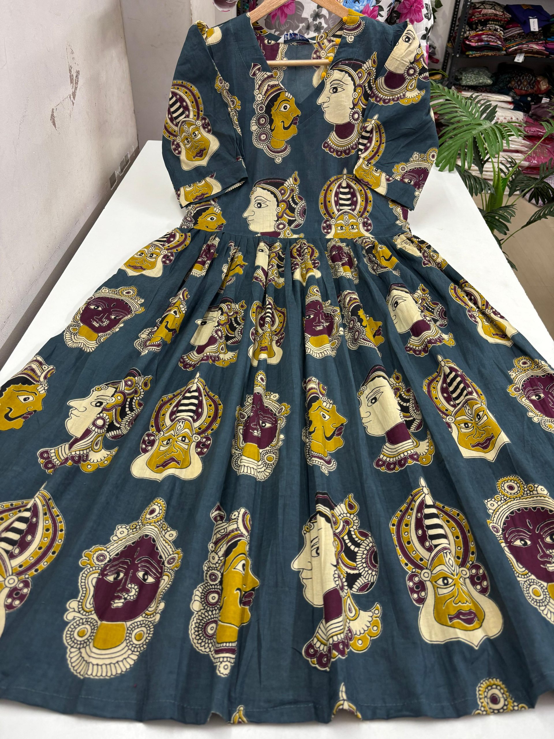 Kalamkari Style Mul Cotton Maxi With Lining Sleeve- 3/4th sleeves Fabric: Mul Cotton Length: 44 inches