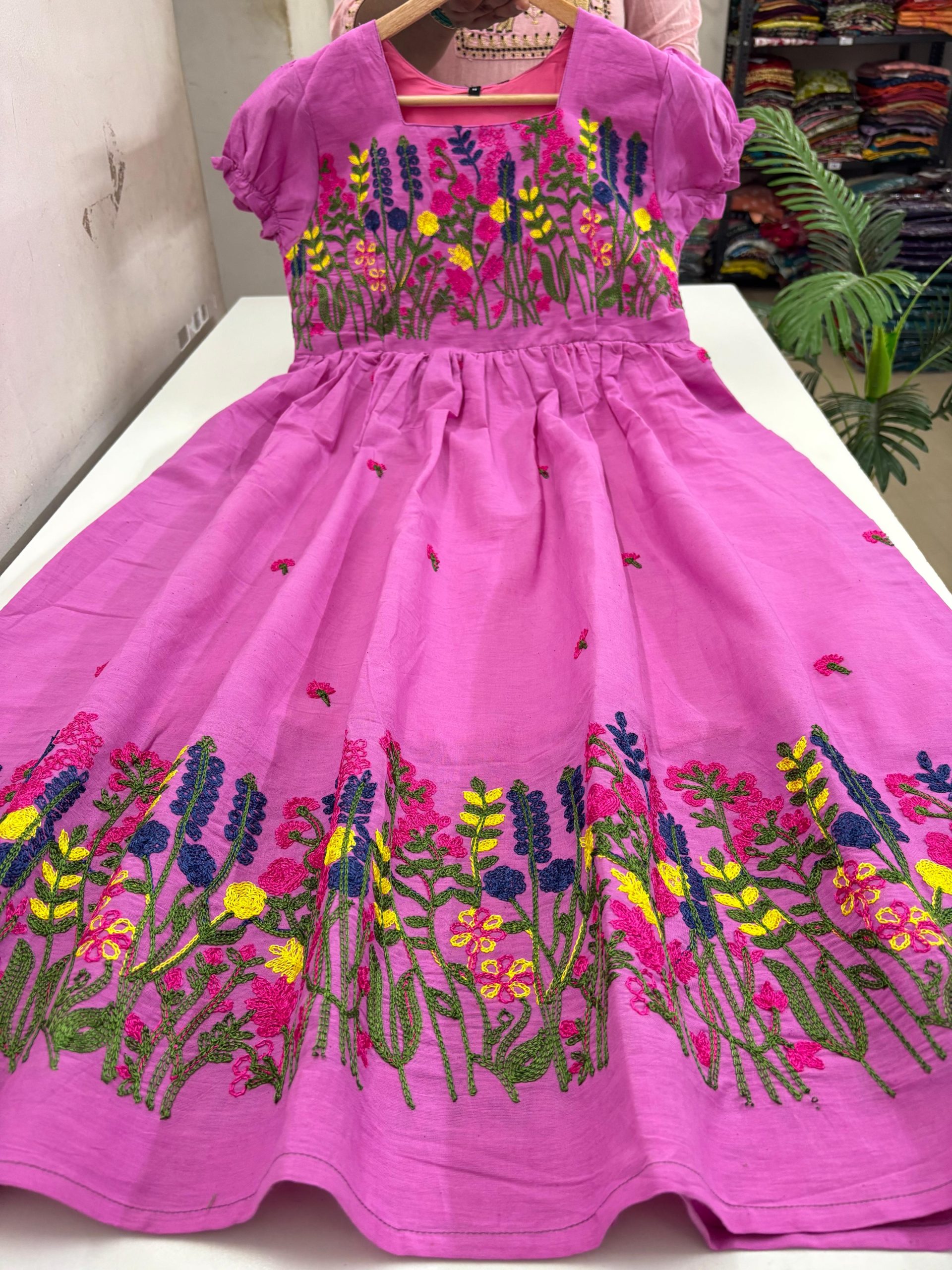 Hakoba A Line Frock With Puff Sleeves Beautiful Embroidery Thread Work On Yoke Portion Stitched With Cotton Lining Length: 44