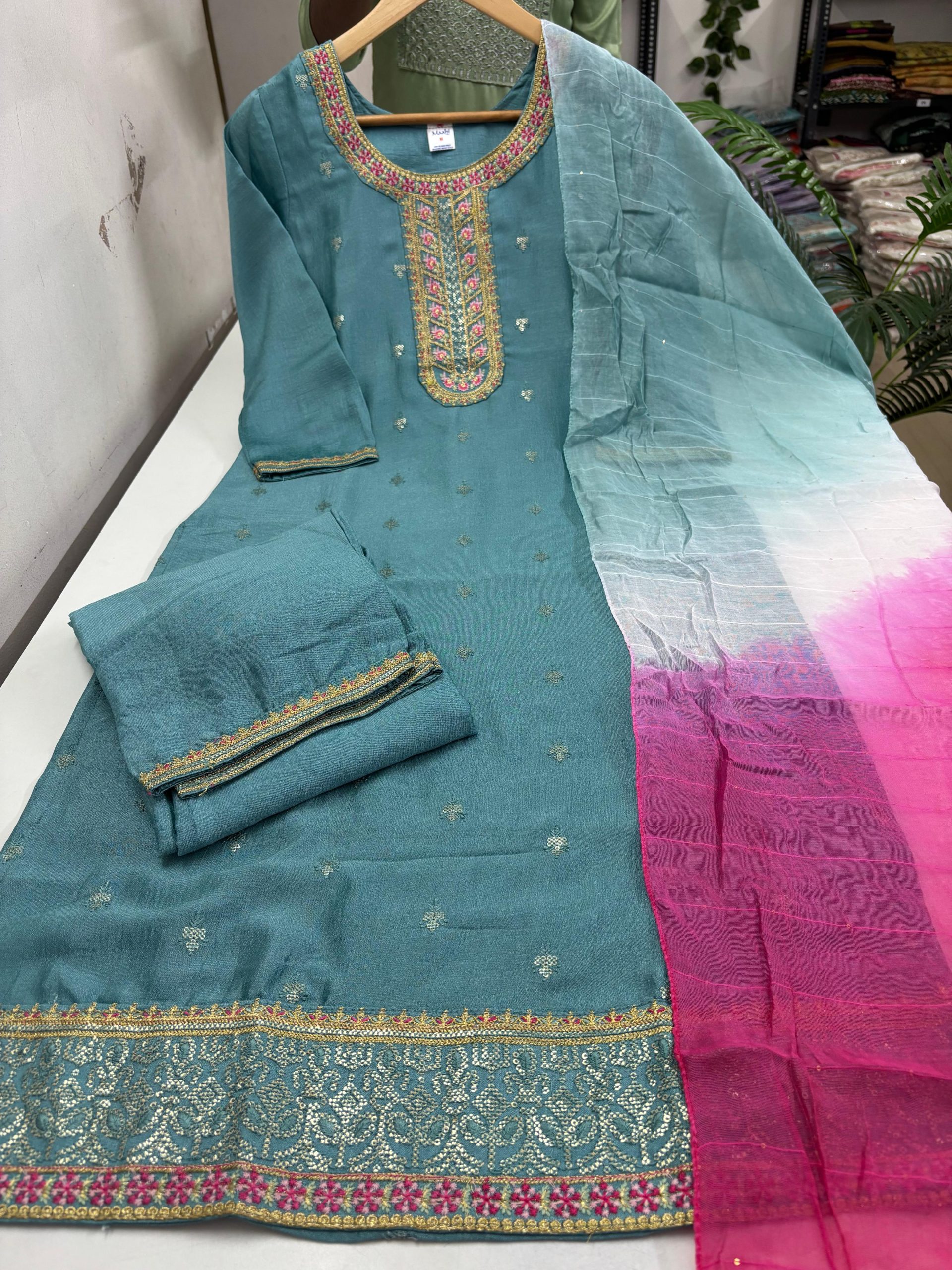 Festive Wear Kurti With Pant & Dupatta Set With Lining Fabric: Vichitra Silk Kurti Length : 44 inches Pant Length
