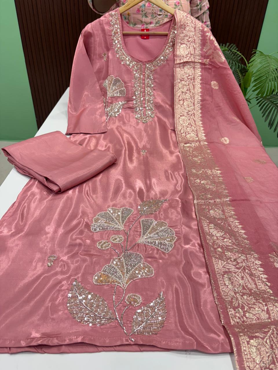 Premium Glass Tissue Silk Kurti With Pant & Dupatta Set