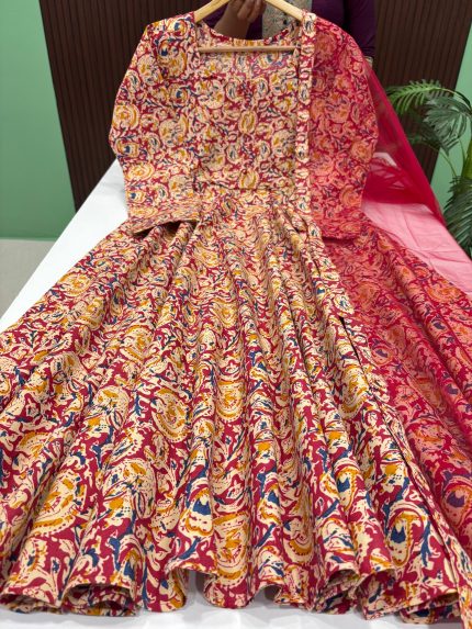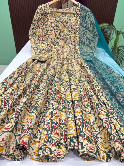 Trending Kalamkari Printed Anarkali & Dupatta Set With Full Sleeves Fabric: Mixed Cotton Anarkali Length: 48 inches Sleeve Length: 22